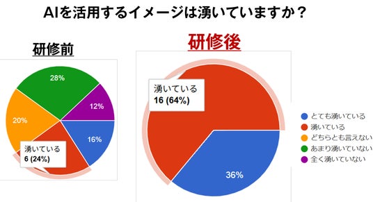 研修後のアンケートでは、参加者の64%が「とても満足」、36%が「やや満足」と、参加者の100%が「満足」と回答しました。前回の岩倉高等学校における研修(詳しくはこちら)に続き、再び満足度100%を達成しました。また、研修前に「AIを活用するイメージが湧いている」と回答した方は24%でしたが、研修後には64%に増加し、研修を通してAIに対する具体的なイメージを持つことができた先生が非常に多かったことが伺えます。