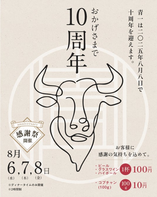 この特別な3日間は、焼肉ホルモン青一が10年間培ってきた味と品質を、ぜひお得にお楽しみください。