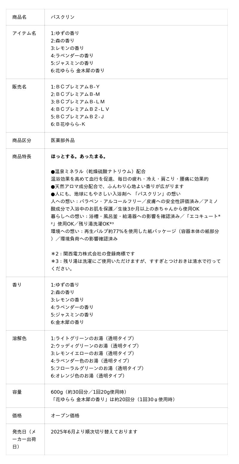 株式会社バスクリン(本社:東京都千代田区 社長:三枚堂正悟)は、発売から95周年を迎えるロングセラー入浴剤「バスクリン」シリーズを、このたび装いも新たにリニューアル発売いたしました。1930年の発売以来、「バスクリン」は世代を超えて多くのご家庭に親しまれてきました。天然アロマ(香料成分)の心地よい香りが浴室に広がり、まるで家族と過ごす時間のような、心までほっとくつろげるひとときをお届けしてきました。これからも、家族のバスタイムに寄り添い、皆さまの毎日にあたたかさをお届けしてまいります。