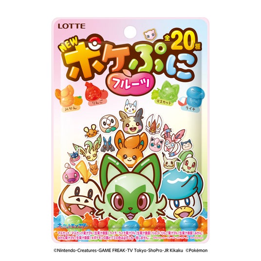 さらに、待望の2品目「ポケぷに<フルーツ>」も新登場!こちらも20種類のポケモンの顔をかたどった、ちいさくてかわいいグミで、みかん、りんご、マスカット、ライチの4つの味わいが楽しめるアソートタイプ。2品とも、4つの味×20種類の形、全部で80通りのグミが楽しめる上に、ソーダとフルーツでそれぞれ異なるポケモンの形のグミが登場。