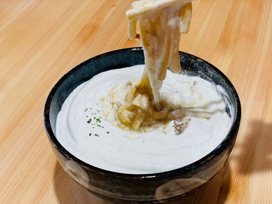 「雲海カレーうどん」は、温かいカレーうどんの上に、なめらかなポテトクリームをたっぷりと乗せ、雲海を表現しました。クリーミーなポテトとスパイシーなカレーうどんの組み合わせが絶妙で、見た目も味も満足できる楽しい一品です。