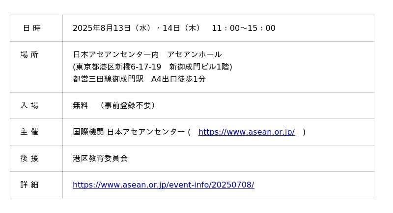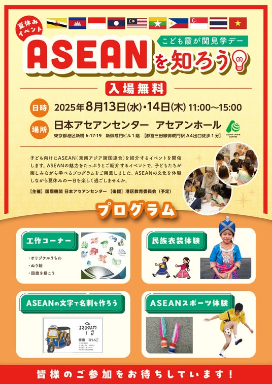 国際機関 日本アセアンセンター(東京都港区、事務総長:平林国彦 以下、センター)は、2025年8月13日(水)・14日(木)の2日間、未就学児から小学生を対象とした体験イベント「ASEANを知ろう!」を開催します。本イベントは、「こども霞が関見学デー」の一環として行われ、ASEAN諸国の文化や遊びに楽しくふれられる内容となっています。