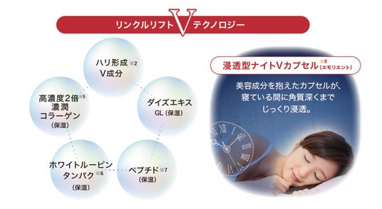 好調な「リンクルケア」シリーズから、40~50代の女性に多い「シミ・シワ・ハリ不足」といった肌悩みや、睡眠不足による肌への悪影響を回避する夜美容への関心の高まりを受けて、このたび「リンクルケア リンクルリフトV ナイトリペアクリーム」を発売します。睡眠中にハリを形成※2する独自処方で、翌朝の肌に変化を実感できる設計となっています。休息時間を美しさの積み重ねに変える"夜に仕込むケア"でさらなる愛用者拡大を目指します。