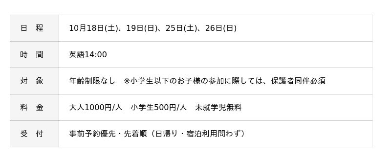 ※上記日程のハロウィンマナーハウスツアーは、ご宿泊のお客様も有料となります。