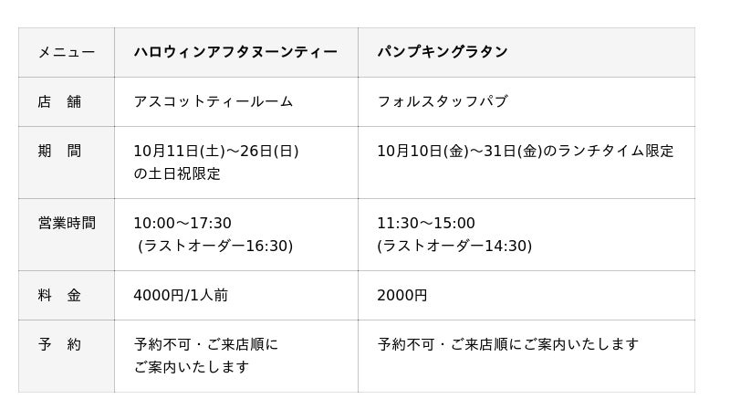 ハロウィン期間限定の特別メニューをご用意しております。秋の味覚と英国の伝統文化が楽しめるメニューで、秋の訪れを感じてみてください。