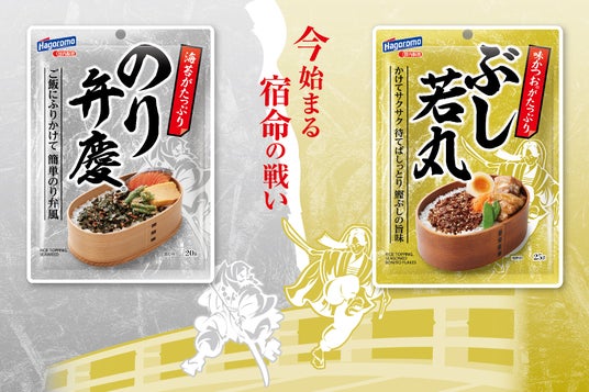 「のり弁慶ふりかけ」はのりをたっぷり使用したふりかけです。今回発売する「ぶし若丸ふりかけ」は、味かつおをたっぷり使用したかつお節本来の旨みを味わうふりかけです。並べてみると一目瞭然。のりと味かつおを、弁慶と牛若丸の戦いからその後の運命になぞらえて、「ぶし若丸ふりかけ」も史実のように「のり弁慶ふりかけ」を超える製品に成長してほしいという願いを込めたネーミングになっています。