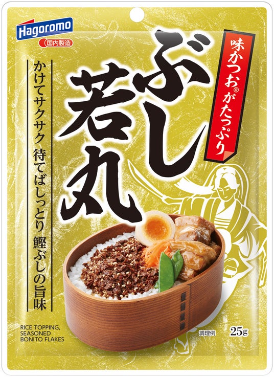 「ぶし若丸ふりかけ」は、当社自慢の"味かつお"をたっぷり使い、かつお節本来のおいしさが堪能できる、食べ応え抜群のふりかけです。顆粒を使わず、当社のふりかけ製品の中で最も"味かつお"を多く配合していることから、かつお本来の旨みも楽しめるふりかけです。