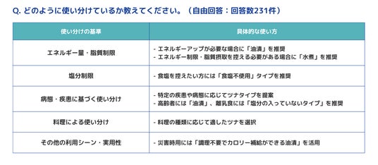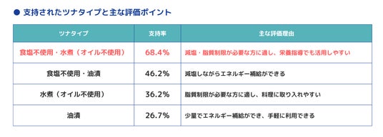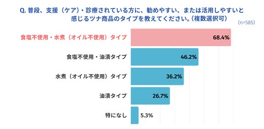 その結果、ツナの使い分けに関する医療従事者の意識や評価が明らかになり、「食塩不使用・水煮(オイル不使用)」タイプが最も支持を集めました。
