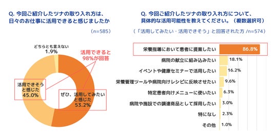 ツナの実用性を確認したところ、98%の医療従事者が「ツナは日々の業務に活用できる」と回答しました。活用方法として「栄養指導において患者に提案したい」(86.8%)が最も多く、ツナの汎用性や指導のしやすさが評価されていることがわかりました。