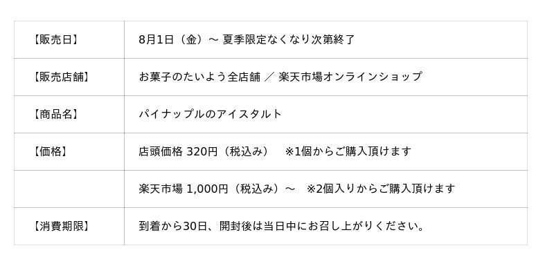 株式会社太陽社(所在地:千葉県匝瑳市飯倉293、代表取締役:片岡正裕)が展開する千葉県で長年愛される菓子店「お菓子のたいよう」は、2025年夏の新作「パイナップルのアイスタルト」を8月1日(金)に発売いたします。