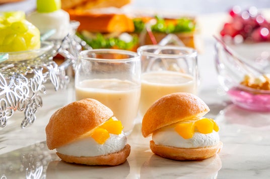 セイボリーでは糖度が高くなる初秋の"桃"を使ったメニューも登場。口当たりなめらかな冷製ポタージュに繊細な桃の香りを添えた「ビシソワーズスープ 桃のフレーバー」や、ふわふわのメロンパンにフレッシュピーチとクリームを贅沢に挟んだ「ピーチメロンパンサンド」など、シェフの遊び心が光る品々をお楽しみいただけます。さらに、ワゴンサービスでは季節限定のスコーンやボリューム満点のサンドイッチを、お好きなだけお召し上がりください。