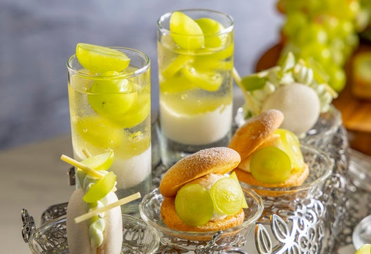 スイーツは全9種類をご用意。シャインマスカットの「ブッセ マリトッツォ風」や「洋風団子」、「テリーヌ」などは、大粒な果実の存在感と芳醇な甘さを生かしました。軽やかなシュー生地にジューシーな果肉が弾ける「シャインマスカットシュークリーム」や、透明感のあるゼリーと杏仁豆腐のバランスが絶妙な「シャインマスカットとブドウゼリー杏仁豆腐」など、見た目の美しさや爽やかな香り、そして食感が楽しめます。