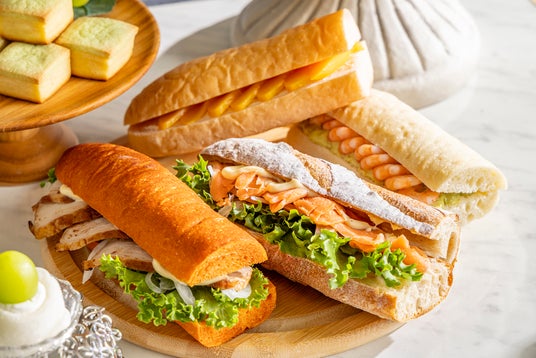 サンドイッチは、スモークサーモンやレタスを挟んだバゲット、アボカド&エビのチャパタサンド、黄桃とクリームチーズを合わせたパンなど、全4種類をご用意。