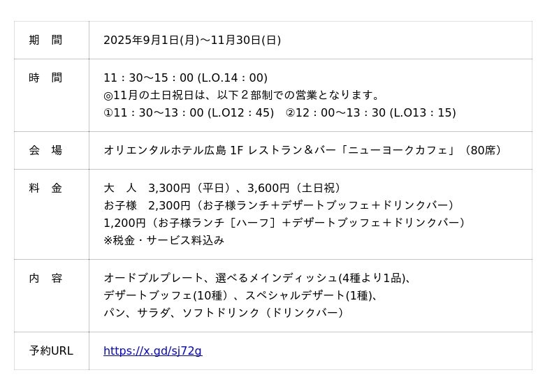 オリエンタルホテル広島(所在地:広島県広島市中区田中町6-10、総支配人:引原史博)の1階レストラン&バー「ニューヨークカフェ」では、2025年9月1日(月)から11月30日(日)までの期間限定で、「デザートブッフェ付きランチ 2025 Autumn」を提供します。