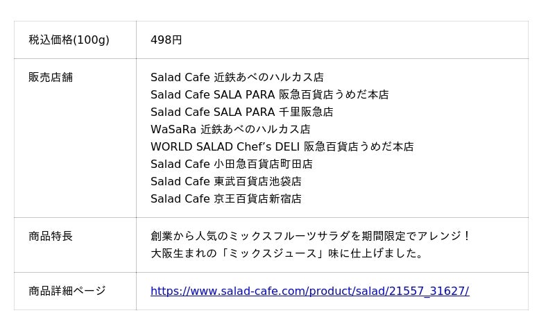 20周年を記念して発売する新商品の中で、注目は、サラダカフェで創業以来人気のミックスフルーツサラダをアレンジした『5種果実のフルーツサラダ~大阪名物ミックスジュース味~』です。ミックスフルーツサラダは季節によってフルーツの種類が変わり、年間を通して様々な味が楽しめることから、お子様や女性を中心にご好評いただいています。今回はバナナ、りんご、もも、パイナップル、マンゴーの5種のフルーツに、ミックスジュース味のソースを合わせました。サラダカフェの本社のある大阪らしさを意識し、大阪発祥とされるミックスジュースの風味を再現した、期間限定の特別な一品です。