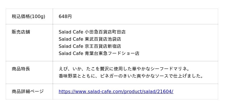『野菜の旨味を味わう ポテトサラダ』は、皮つきのじゃがいもを使用し、素材本来の味を感じるポテトサラダです。野菜の旨味がきいたマヨネーズソースで、じゃがいもの風味が引き立つよう作りました。サラダカフェで安定した人気を誇るポテトサラダを、ごろっとしたじゃがいもや半熟ゆで卵の具材感が楽しめる新しいポテトサラダとしてご提供します。『3種海の幸のご馳走マリネ』は、えび、いか、たこを贅沢に使用した華やかなシーフードマリネです。香味野菜とともに、ビネガーのきいた爽やかなソースで仕上げました。カラフルな見た目が食卓を華やかに彩ります。