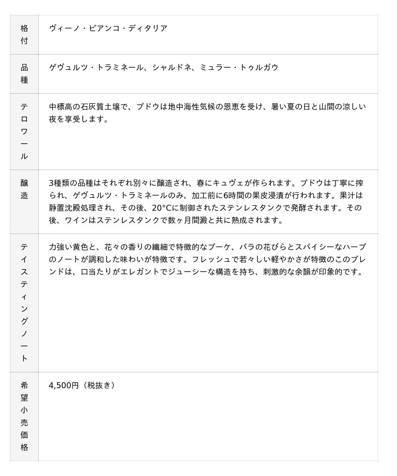 ■ Pinot Bianco(ピノ・ビアンコ)についてアルト・アディジェを代表する白ブドウ品種。フレッシュなリンゴなどのフルーティなアロマにハーバルなタッチをもつブーケ。エレ ガントで深みのあるミネラルといきいきとした酸の絶妙なバランスは山のワインならではの味わいです。