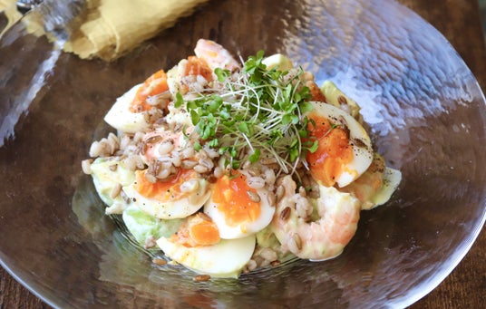 - ボウルにボイルえび、アボカド、「もち麦&スーパー大麦」、【合わせ調味料A】を入れ和えます。茹で卵も加え、やさしく和えます。