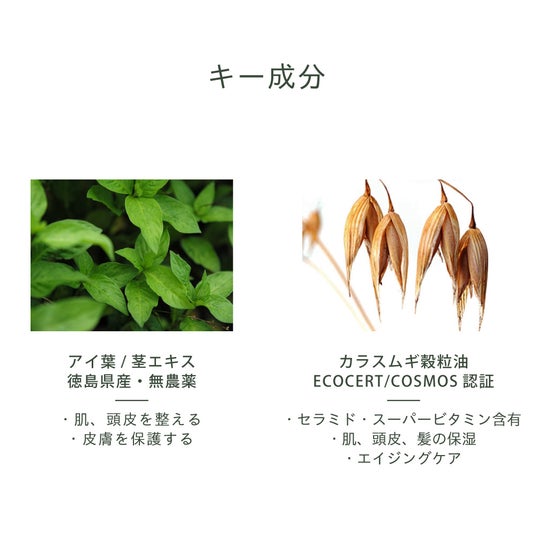 カラスムギ穀粒油に含まれる天然セラミドとスーパービタミンEが、肌の角質層と髪のキューティクルを補修し、保湿力を持続させます。
