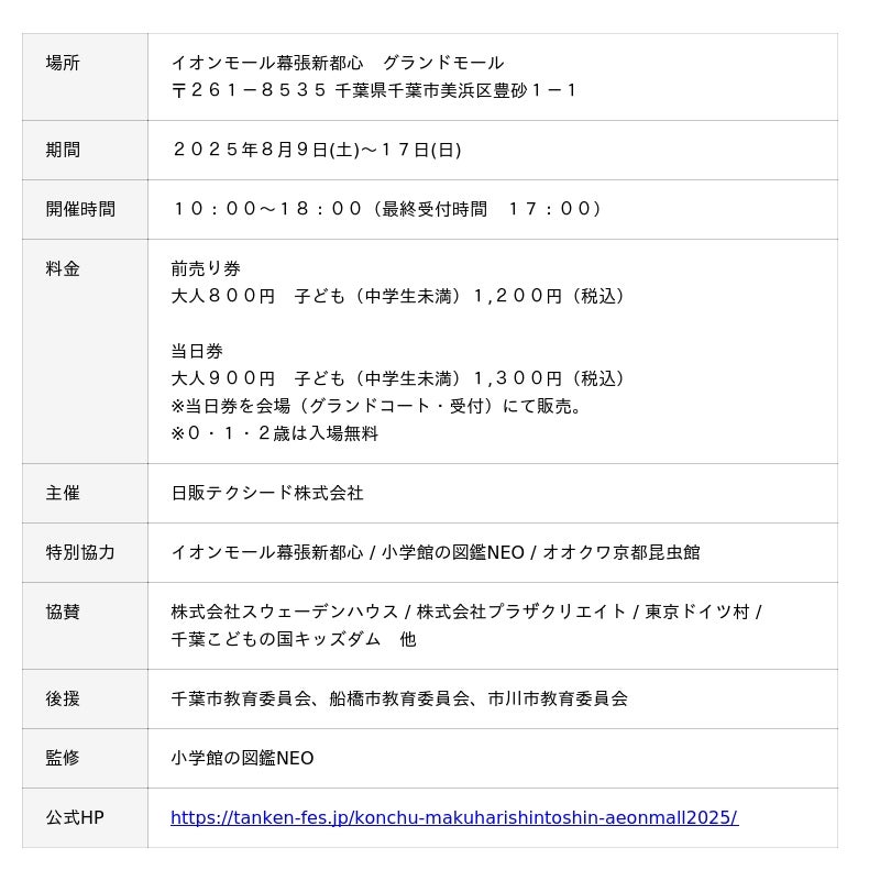 楽しみながら学べるエデュテイメントソリューションの開発を手掛ける日販テクシード株式会社(代表取締役社長:藤澤 徹)は、学習図鑑売り上げNo.1『小学館の図鑑NEO』の特別協力・監修のもと、「小学館の図鑑NEO たんけん昆虫フェス~きみはギラファ派、それともヘラクレス派?~」を2025年8月9日(土)~17日(日)まで、イオンモール幕張新都心グランドモール(千葉県千葉市)で開催いたします。