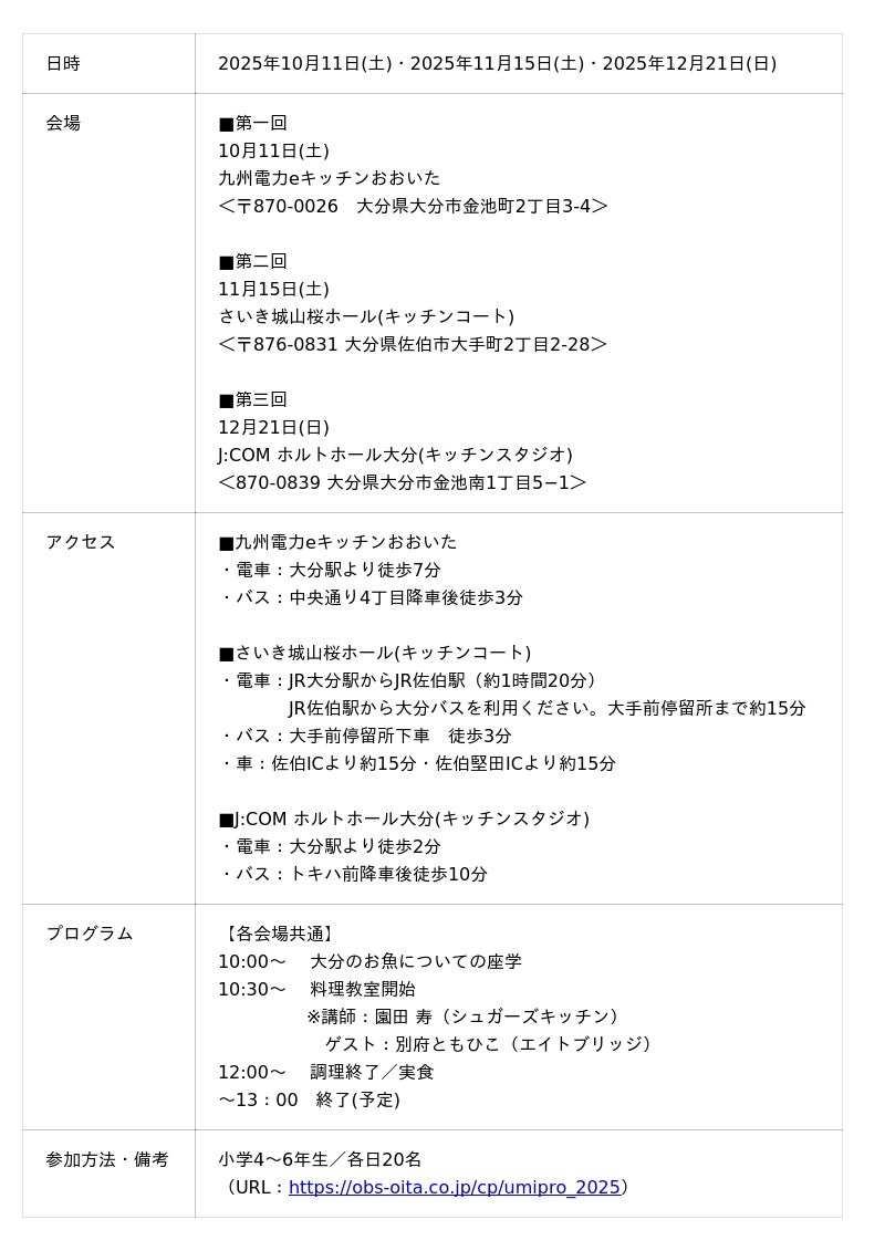 2025年10月11日(土) ・11月15日(土)・12月21日(日)<大分市内・佐伯市内>