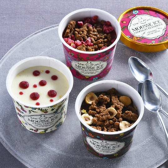山羊のミルクで作られた新感覚アイス自社牧場で育てたヤギのミルクを使用。解凍してムースとしても楽しめる新感覚アイスです。ヘーゼルナッツムースにほろ苦いコーヒージュレ、チョコムースにフランボワーズやカシスソースを合わせたりと、どれも底面にはクッキー生地が敷かれ、食感の対比も楽しい!