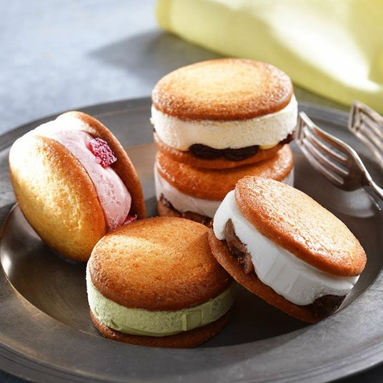老舗が作る和菓子派にも洋菓子派にも好まれる一品自社農園栽培の阿波和三盆糖を使ったしっとりと香り高いサブレに自家製ジェラートをサンド。ジェラートは、ラムレーズンと濃厚バニラ、小豆と漉し餡ミルク、自社栽培イチジクにクリームチーズなど素材の重なりが秀逸。和菓子派にも好まれる品のよさと、アイスケーキのような贅沢感を楽しんで。