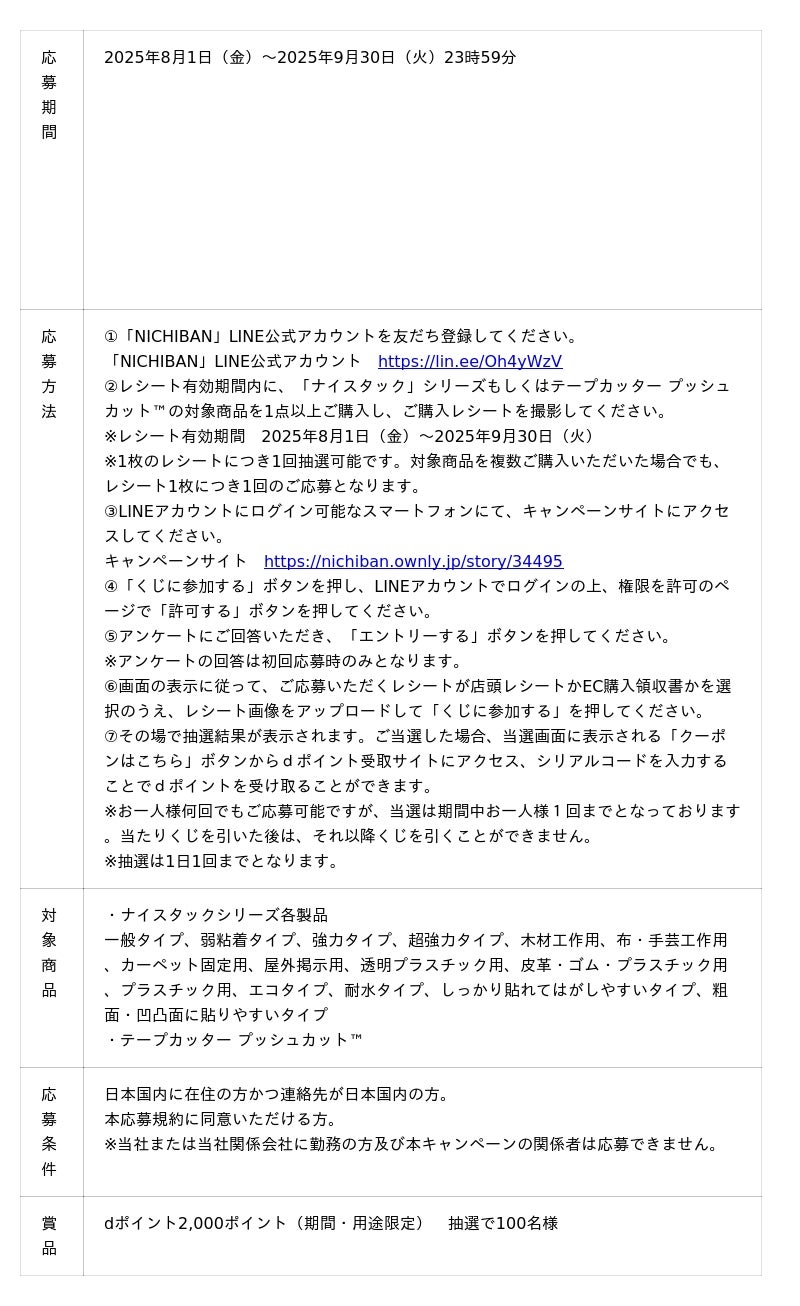 ※レシートに記載されている商品名に「ナイスタック」「プッシュカット」「ニチバン 両面テープ」などの記載がなく、対象商品であると確認できないものはご応募の対象外となります。