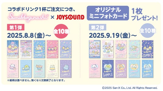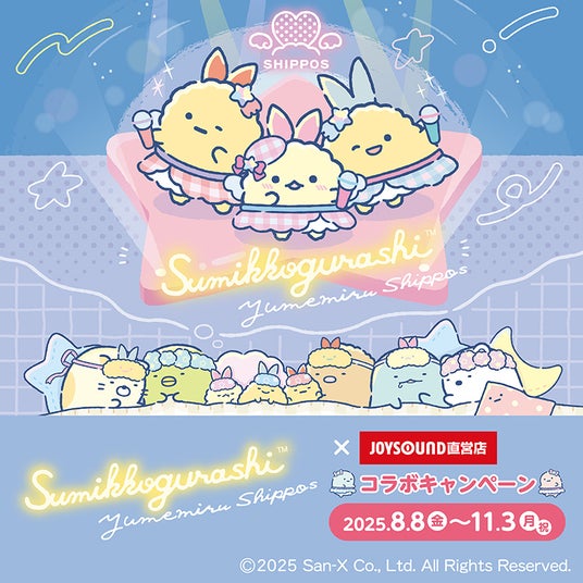 サンエックス株式会社(本社:東京都千代田区、代表取締役社長:千田洋史)は、全国にカラオケ店舗・ネットカフェ店舗を展開する株式会社スタンダード(本社:東京都港区、代表取締役社長:小林克章)により、2025年8月8日(金)から2025年11月3日(月)までの期間中、「すみっコぐらし×JOYSOUND直営店コラボキャンペーン」が開催されることをお知らせします。当コラボでは、すみっコぐらしの人気シリーズ『夢みるしっぽず』をテーマに、JOYSOUND池袋西口公園前店(東京)・JOYSOUNDなんば戎橋店(大阪)の2店舗にカラオケコラボルームがオープンします。また、JOYSOUND直営店65店舗にて、オリジナルミニフォトカード付きコラボメニューが展開されるほか、一部店舗およびオンラインストアにて、オリジナルグッズが販売されます。
