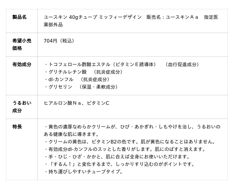「ユースキン 40gチューブ ミッフィーデザイン」は、職場や外出先でのケアはもちろん、お子さまと一緒のご使用など、さまざまなシーンで多くのお客様にご愛用いただいております。今年も装いを新たに、数量限定で発売いたします。