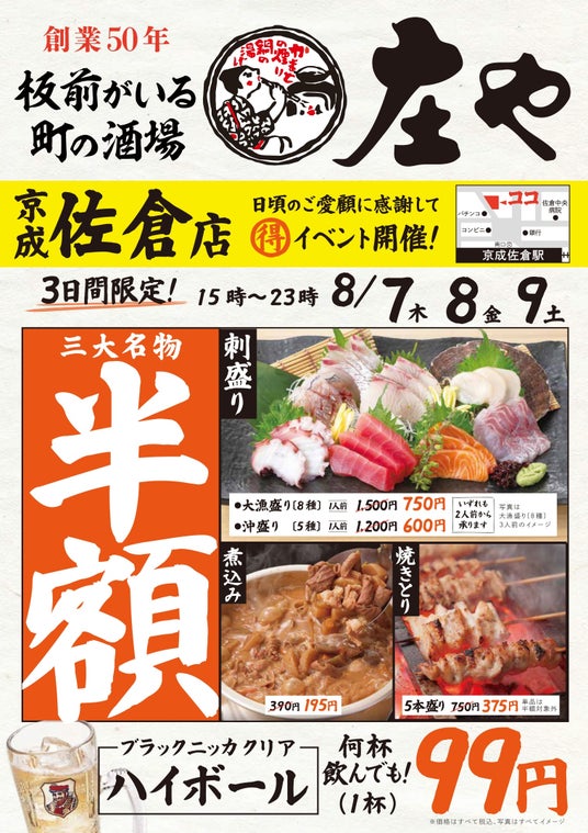 【京成佐倉『庄や』で半額セール!!】8/7(木)から8/9(土)の3日間限定で直送鮮魚の刺身盛りに焼き鳥、もつ煮込みも超特価
