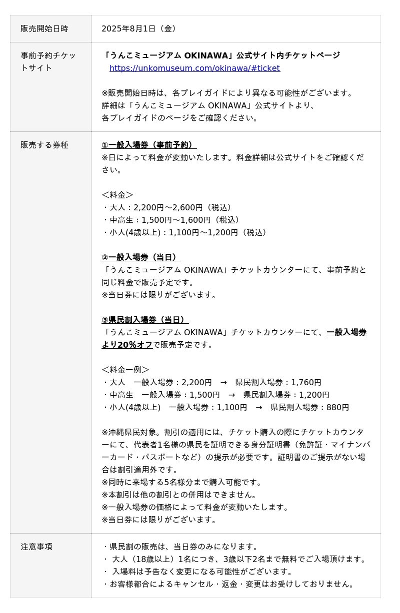 チケットは、オンラインで事前予約可能な一般入場券に加え、会場での当日券も販売予定です。なお当日券に限り、沖縄県民を対象に、一般入場券より20%オフで購入いただける「県民割」を実施いたします。ご家族でのお出かけや恋人とのデートなど様々なシーンで、地元の方に何度もお得に楽しんでいただきたいとの想いで、「うんこミュージアム」史上初めての試みとなります。