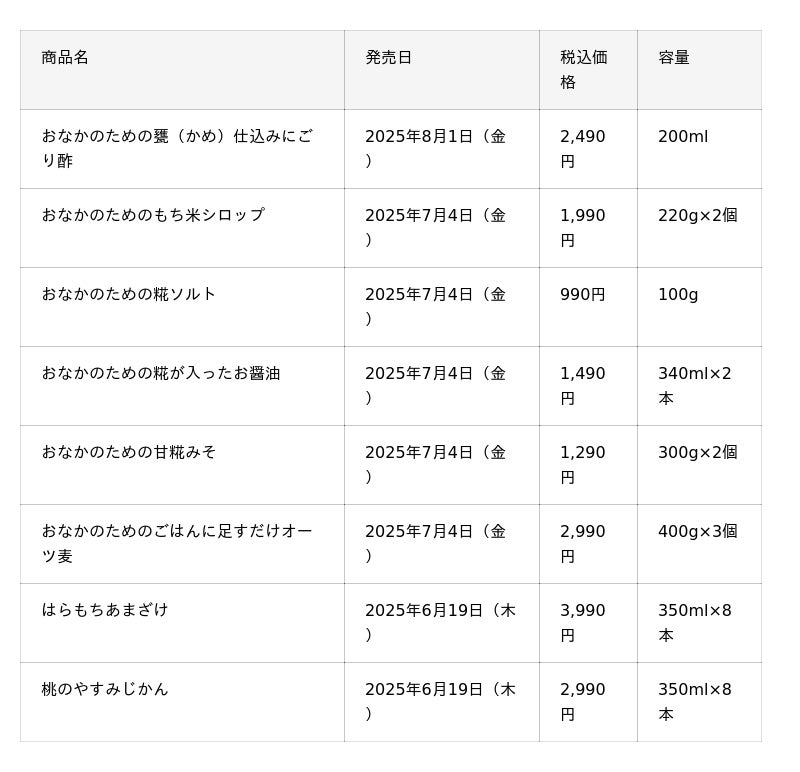 「はらもちあまざけ」(8本セットで税込3,990円/1本350ミリリットル)は、一般的に用いる「砂糖」や「かけ米」を使わず、「米糀」だけで作るアルコール度数0.00%の「甘酒」です。すっきりとした味わいで、ブレンドした「もち麦(大麦)」のプチプチとした食感も楽しめます。「もち麦」は、体内で消化されずに腸まで届く水溶性食物繊維「β-グルカン」を豊富に含みます。その水溶性食物繊維が、腸内の「善玉菌」を増やして、便通を整えるとともに、腸の免疫細胞に働きかけて、免疫力の向上をサポートします。