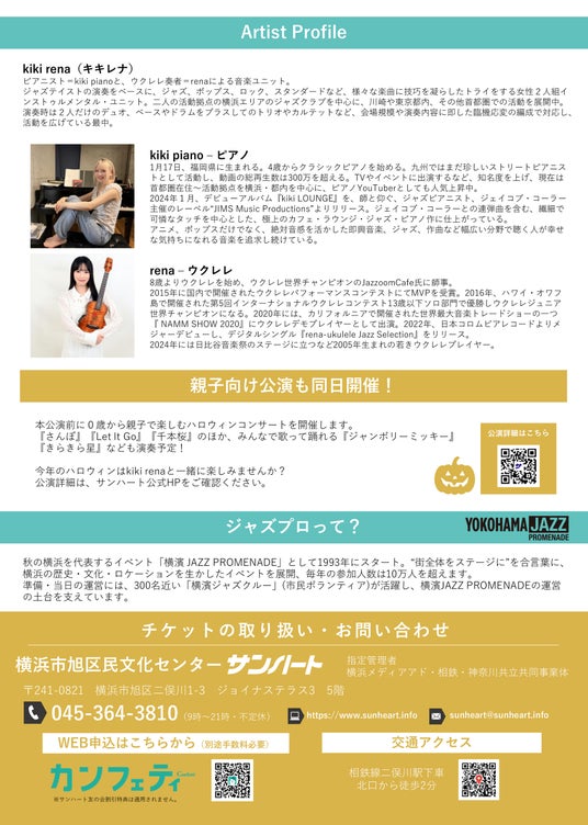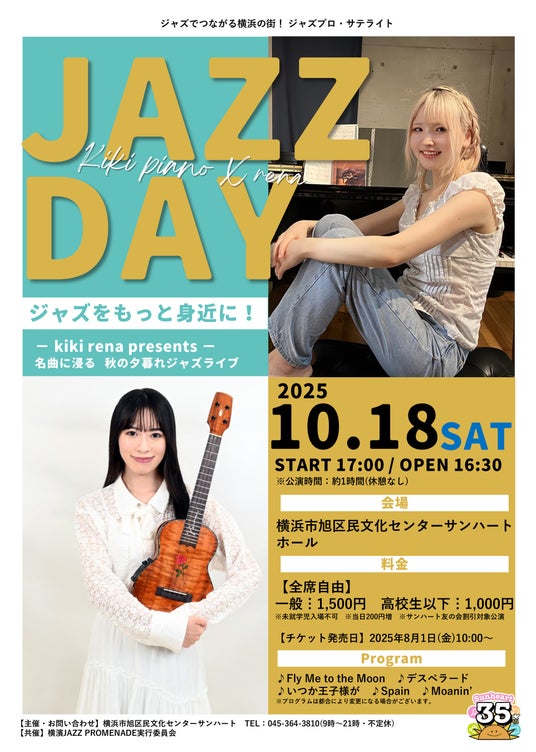 横浜市旭区民文化センター サンハート主催、「『JAZZ DAY』ー kiki rena presents ー 名曲に浸る 秋の夕暮れジャズライブ」が2025年10月18日 (土)に横浜市旭区民文化センターサンハート ホール(横浜市旭区二俣川1-3 ジョイナステラス3 5F)にて開催されます。 チケットはカンフェティ(運営:ロングランプランニング株式会社、東京都新宿区、代表取締役:榑松 大剛)にて2025年8月1日(金)10:00より予約開始です。