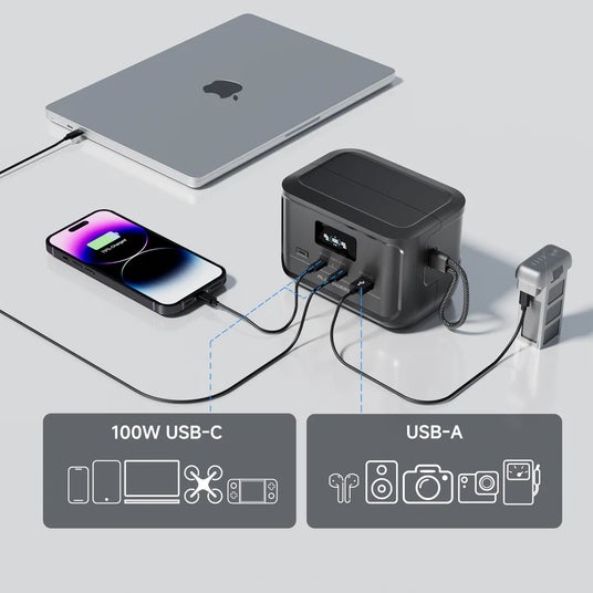 端子はUSB-C出力×2口、USB-A出力×1口を搭載し、ノートPCやスマートフォン、タブレット、カメラなど複数機器を同時に充電可能。アウトドアや旅行はもちろん、停電時の備えやビジネス出張時にも活躍します。