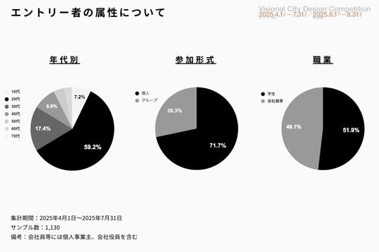 また、応募者の年齢層も広がりを見せており、20代が最も多く668名、次いで30代196名、40代101名、10代81名と、若年層を中心に高い関心が寄せられています。さらに50代~70代以上も83名参加しており、都市の未来像を自由に構想し、表現できる本コンペティションの開かれたテーマ性が、多世代・多分野からのエントリーを後押ししたと考えられます。