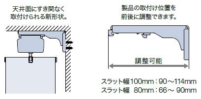 正面付け用の「取付けブラケット」を新形状にリニューアルしました。新ブラケットは、天井面と製品本体との間にすき間が生じにくい構造となっており、意匠性の向上に寄与します。さらに、取付け位置を前後に調整できる機能を備えており、現場ごとの納まりや照明、天井との干渉にも柔軟に対応可能です。