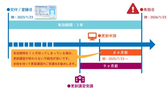 - 有効期間満了の9ヶ月前から更新講習を受講でき、6か月前から更新申請を行うことができます
