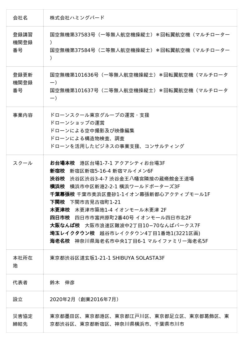 株式会社ハミングバード(ドローンスクール東京)について