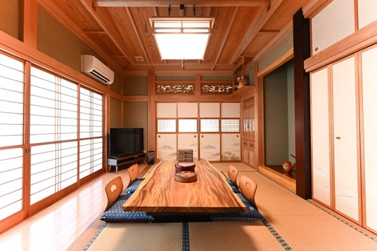 高級旅館クラスの和風建築館内に足を踏み入れると、まず目に入るのはゆったりと構えた広い玄関。高さのある天井には職人の手仕事が光る格天井を設え、けやきの木や紫檀の大黒柱などの無垢の木をあますことなく使った家屋は、高級旅館に滞在しているかのような重厚な和の趣をご堪能いただけます。また、洋室も兼ね備えていて機能的にも滞在しやすい宿となっています。