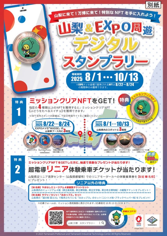 山梨県(知事:長崎幸太郎)は、令和7年8月22日(金)から24日(日)までの3日間、大阪・関西万博の屋内展示場EXPOメッセ「WASSE」において、特設ブース「ハイクオリティやまなしフェスin万博」を出展します。これに先立ち、本日(8月1日)から大阪・関西万博が閉幕する10月13日(月)まで、「山梨&EXPO周遊デジタルスタンプラリー」を開催いたします。