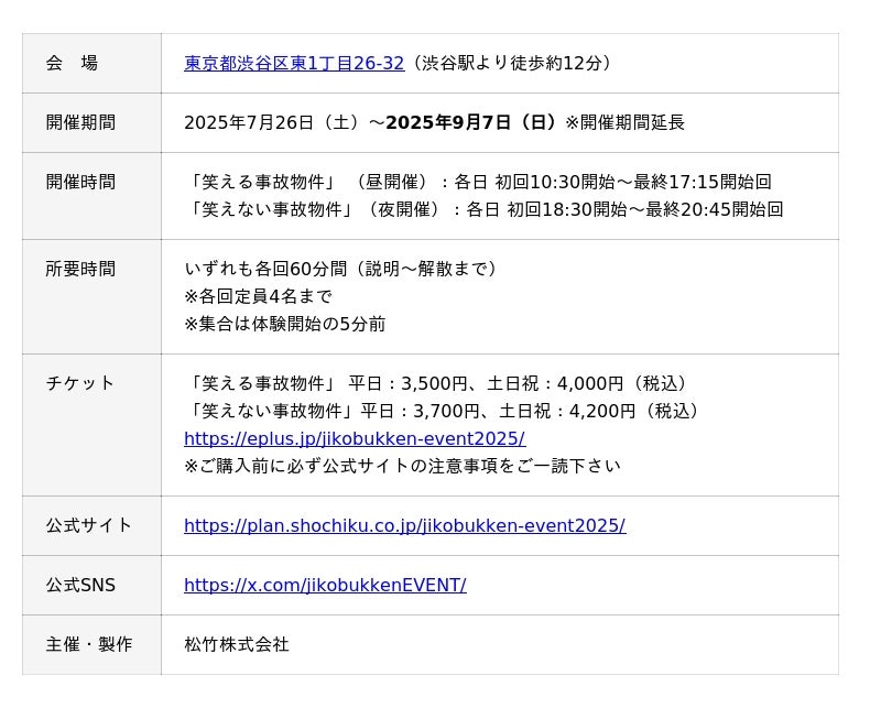 渋谷にて開催中の事故物件調査イベント「笑える事故物件 笑えない事故物件」。本イベントは、参加者自身が"調査員"となり、物件に隠された秘密を解き明かす、かつてない体験型イベントです。映画「事故物件ゾク 恐い間取り」の大ヒットを記念し、より多くの方にこの昼はクスっと「笑える」 、 夜はゾクっと「笑えない」 現象が起こる物件の調査に参加いただきたいという思いから、開催期間を9月7日(日)まで延長することを決定いたしました!