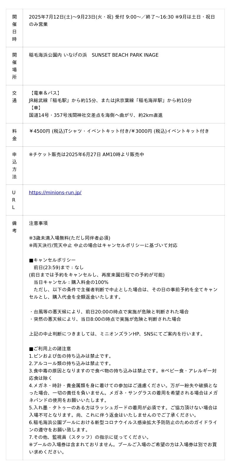 MINIONS RUN 2025 - 稲毛海浜公園内 いなげの浜にて2025年7月12日(土)~9月23日(火・祝) に開催