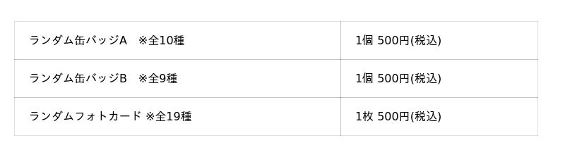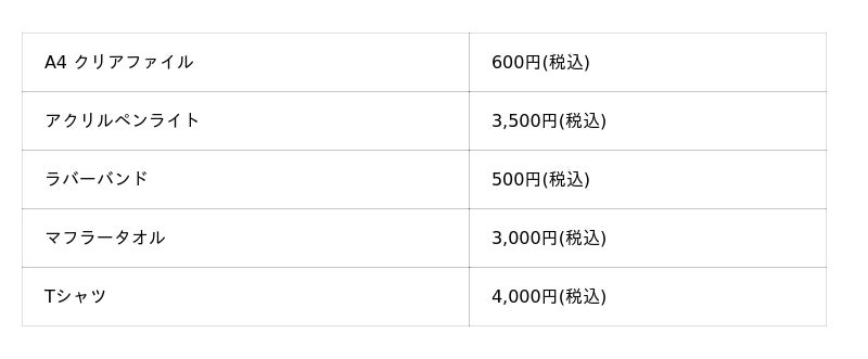 オフィシャルグッズは、当日会場にて【先着順・整列販売】を予定しております。チケットをお持ちでない方もご購入いただけますので、ぜひご利用ください。※商品は各開催日ごとに在庫をご用意しておりますが、上限に達し次第終了となります。予めご了承ください。