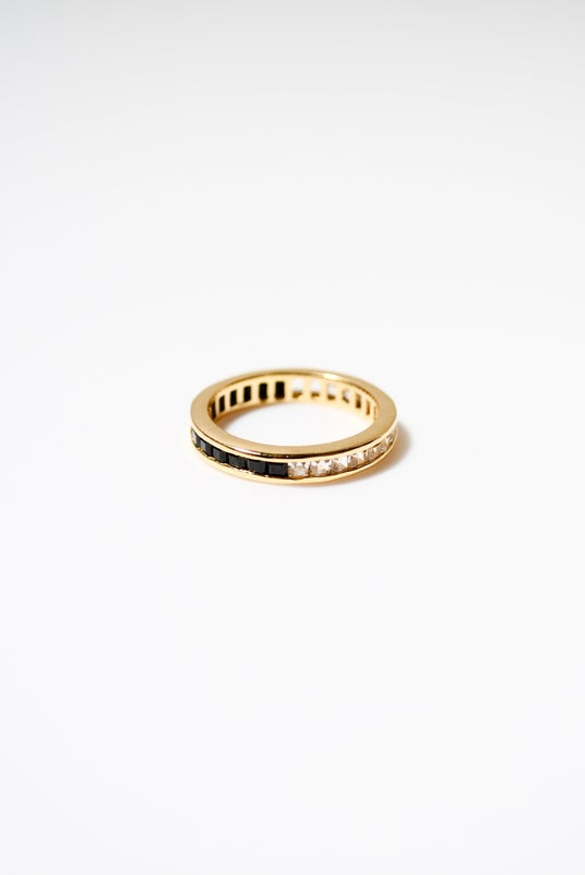 ストーンがハーフ&ハーフで2種類入っているエタニティリング。バイカラーとなっているので、気分に合わせて石を選ぶことができる万能のアイテム。