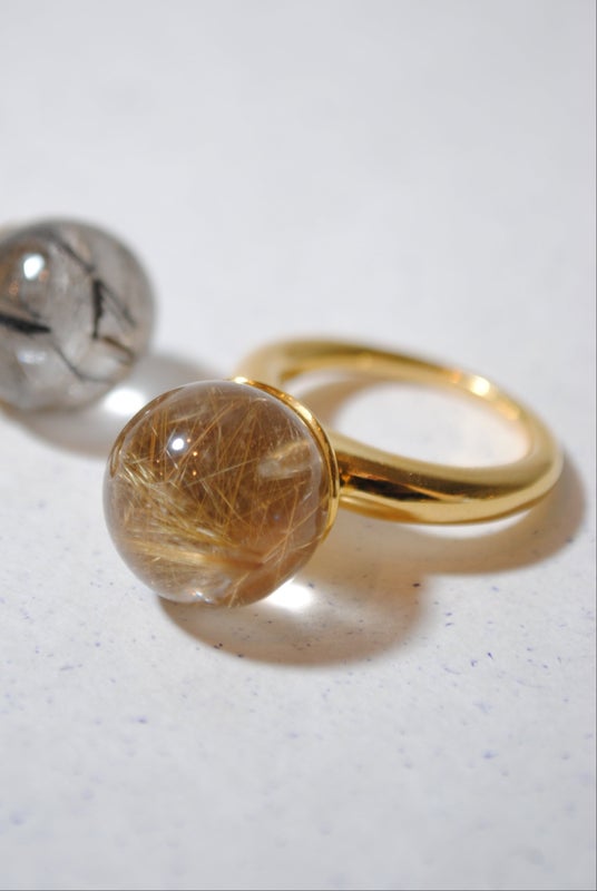 球体にカットしたストーンをセッティングしたリング。ストーンにあらゆる角度から光が差し込んで、様々な表情が楽しめるような設計にしました。