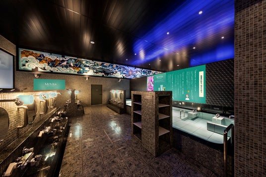 大きな炭酸泉、中温風呂、水風呂の3つに加えて、遠赤外線サウナも備える。お湯は肌にやさしい軟水。アーティストemi tanajiが手掛けた、巨大なクジラを描いた外壁が目印。