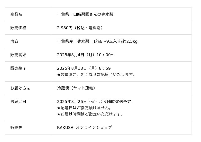 楽彩株式会社(本社:東京都足立区/代表取締役社長:大崎善保)は、夏の疲れた体に嬉しい、千葉県・山崎梨園さんの「豊水梨」を、2025年8月4日(月)10:00より公式オンラインショップにて、特別価格で販売開始いたします。
