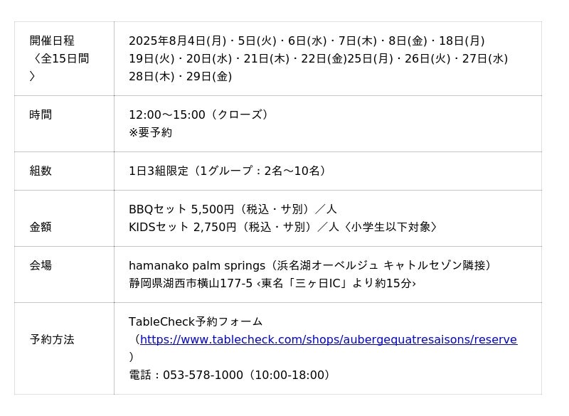 30年以上愛される老舗オーベルジュ「浜名湖オーベルジュキャトルセゾン」が手掛けるグランピング施設「hamanako palm springs」は、オープン1周年を記念し、"日帰りBBQプラン"を2025年8月4日(月)~29日(金)のうち15日間で開催いたします。
