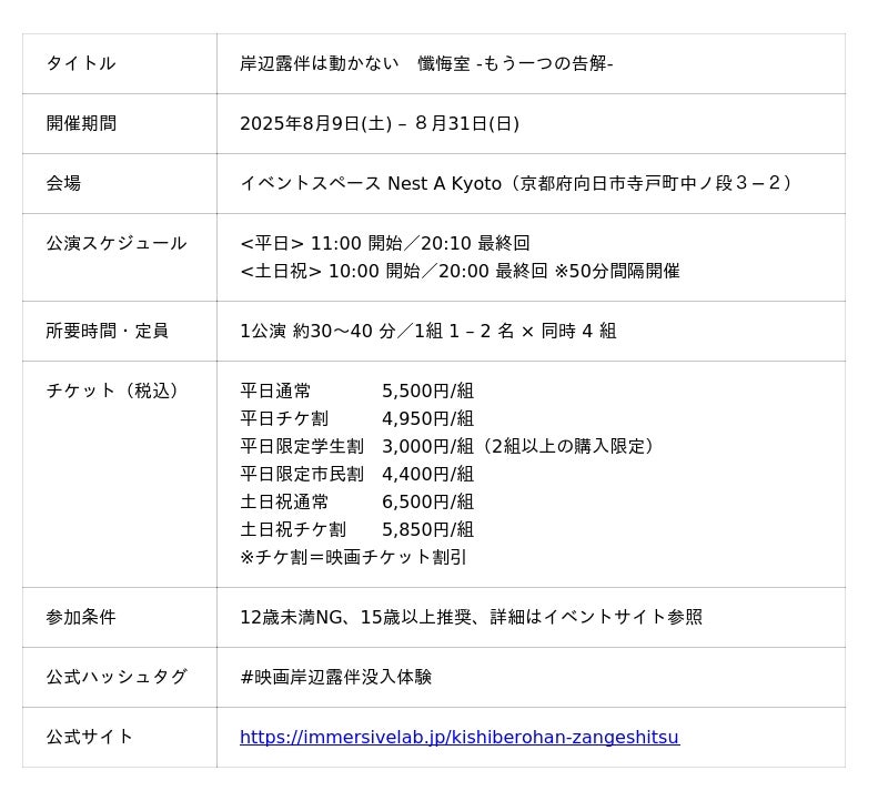 次世代の没入型エンターテインメントを開発・運営する株式会社イマーシブ・ラボ(本社:東京都渋谷区、代表取締役社長:小池 弾、細川 哲星、水谷 優斗)は、荒木飛呂彦原作・映画『岸辺露伴は動かない 懺悔室』(5月23日公開)とコラボレーションした体験型ストーリーゲーム『岸辺露伴は動かない 懺悔室 ─もう一つの告解─』の関西初開催を発表。2025年8月9日(土)から8月31日(日)まで、京都府向日市にて期間限定で実施いたします。本企画は、空き家を"懺悔室"として再生する地域資源活用の試みでもあり、観光振興が期待される向日市を舞台に、新たな文化体験の創出を目指します。